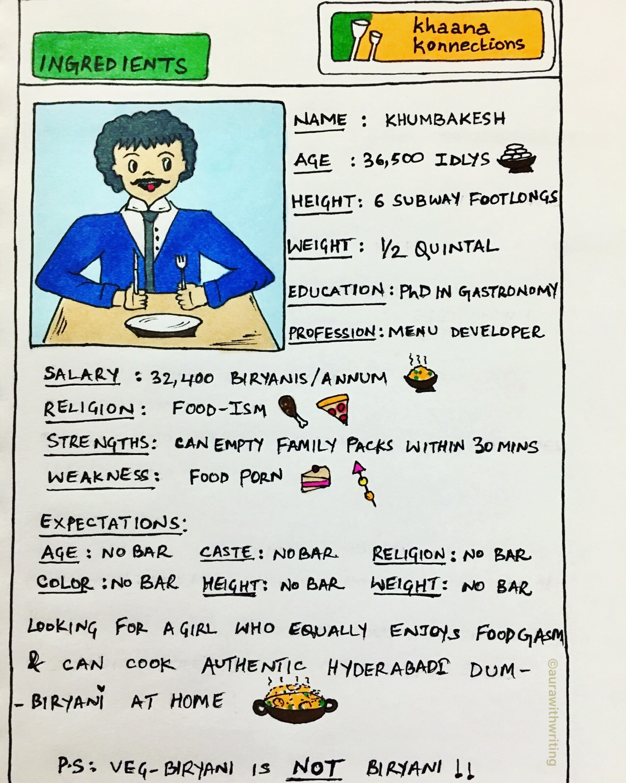 The way to a man’s heart is through his stomach literally holds true for all food lovers. Here is a comical interpretation of how a matrimonial ad would look like on a matrimony platform for foodies. Because they are pretty sure of their constant and are aware that no matter how perfect the vital stats are, how pretty the face is, how easily they fall under their societal standards and how compatible they are, it all boils down to their constant- Food!! They are crystal clear on their agenda of expectations and rather focus on the ability of their potential partner to cook their favorite dish, rather than the religion they follow or the color of their skin.